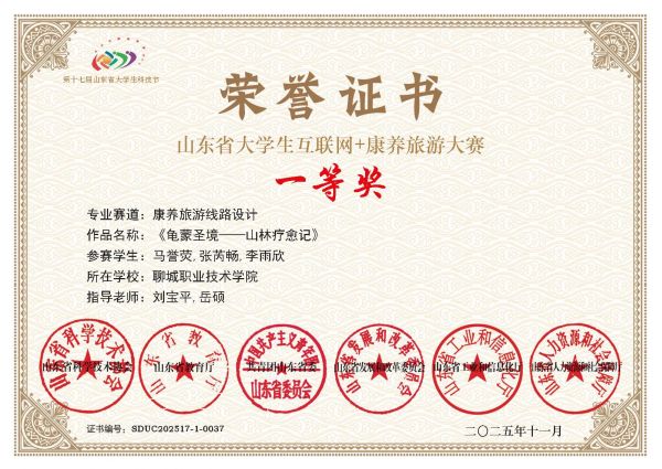 11月13日,第十七屆山東省大學(xué)生科技節(jié)——山東省大學(xué)生互聯(lián)網(wǎng)+康養(yǎng)旅游大賽獲獎名單公示,在劉寶平、岳碩兩位老師的指導(dǎo)下,聊城職業(yè)技術(shù)學(xué)院劉寶平師生工作室成員馬譽熒、張芮暢、李雨欣憑借“康養(yǎng)旅游線路設(shè)計”作品脫穎而出,成功摘得賽事一等獎。