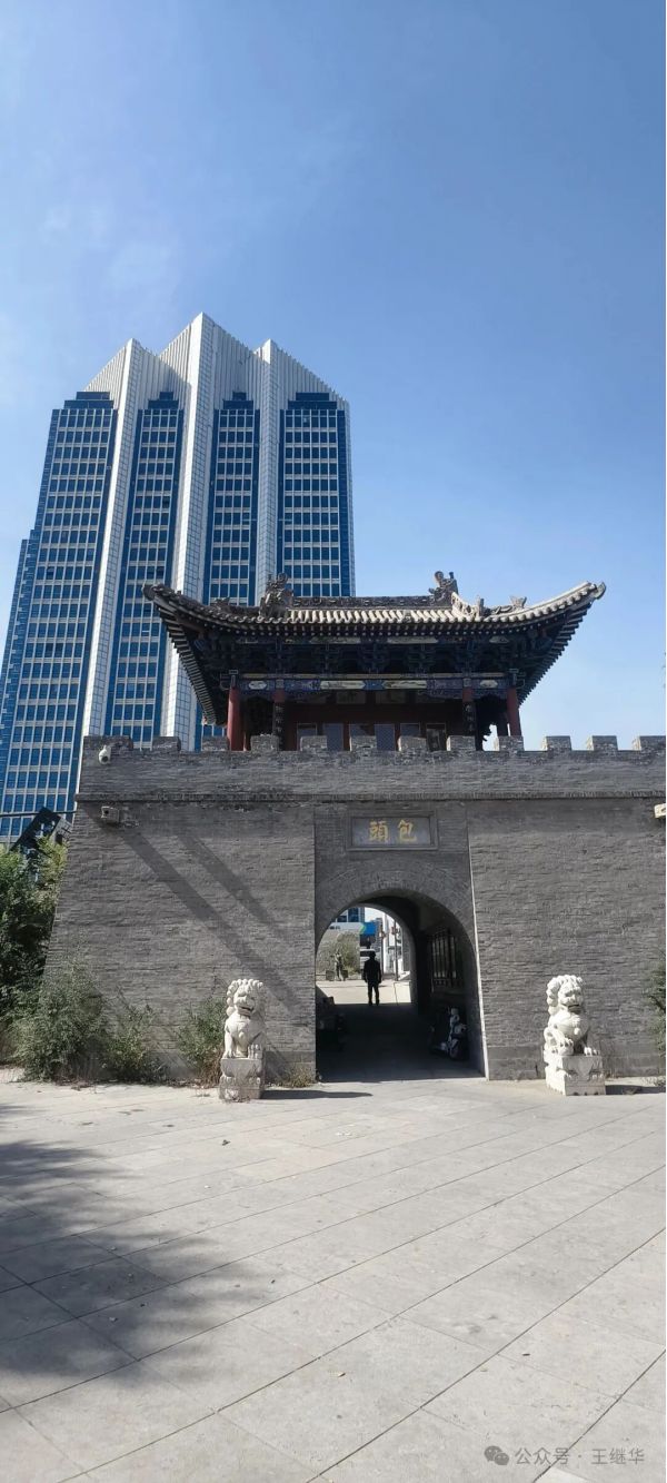 指著前景的古包頭城門與背景的高樓說笑:“你看這新的舊的擠在一塊兒,倒比單看哪樣都有意思?!?/span>