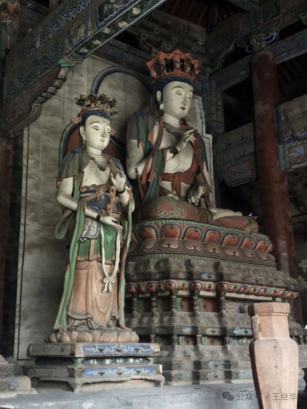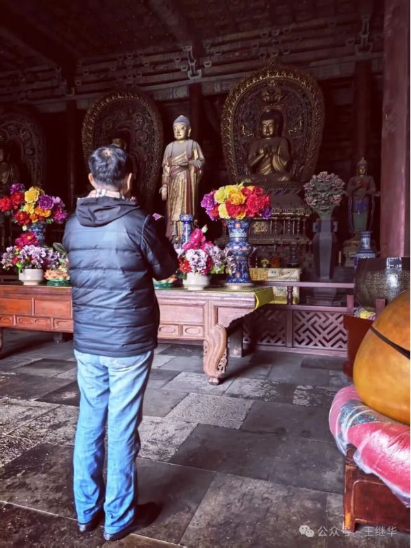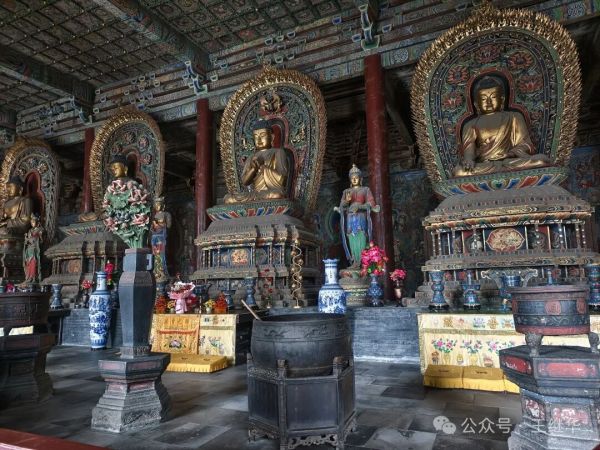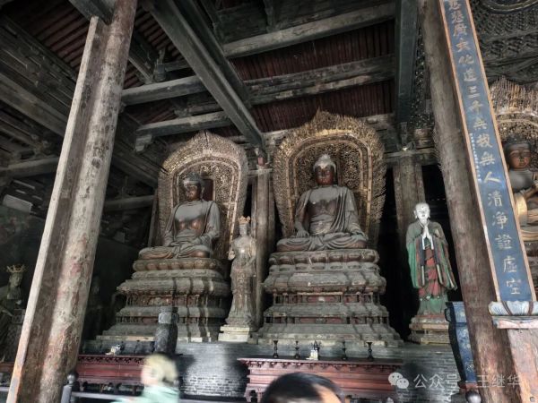 拾級而入,香火氣息混著雨絲漫進殿內(nèi),遼代彩塑華嚴三圣在微光中靜靜佇立,衣袂褶皺仿佛還沾著當年的匠氣。