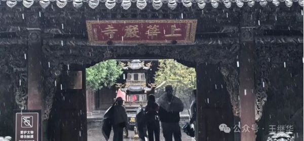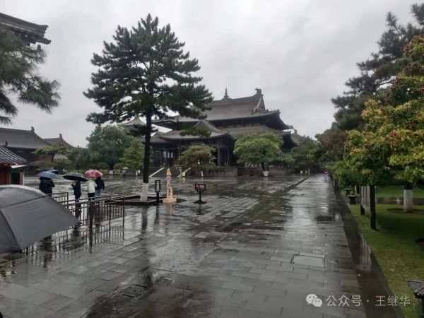再冒驟雨、裹著7℃寒氣奔向華嚴寺時,朱紅山門正蒸騰著朦朧水霧。檐角銅鈴在風雨中低吟,將千年古剎的莊嚴揉進濕潤的空氣里,腳下青石板積著水洼,倒映著大雄寶殿的飛檐斗拱,恰似把整座寺院裝進了鏡面,恍惚間不知是在人間還是鏡中。