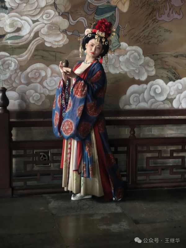 正欲細賞壁上壁畫,卻見殿外廊下閃過一抹亮色——幾位女子身著唐裝,對襟襦裙被雨水打濕了邊角,發(fā)間銀簪卻依舊耀眼。她們?nèi)徊活櫤?,或倚著紅柱整理裙擺,或舉著相機對著經(jīng)幢取景,笑鬧聲穿過雨幕,為肅穆的古寺添了幾分鮮活。