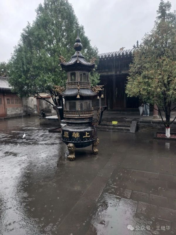 離開前在普賢閣旁,導游指著樓閣飛檐:“金代修這座閣時,特意讓檐角向外翹得更陡,就是為了讓雨水更快落下,保護木構?!庇赀€沒停,褲腳已濕得透涼,手腳凍得發(fā)麻,可想起她講的古建智慧,倒覺得這場低溫冷雨,讓善化寺的千年故事聽得更清楚——原來時光從不是悄無聲息的,它藏在雨滴敲打的節(jié)奏里,藏在木構呼吸的紋理中。